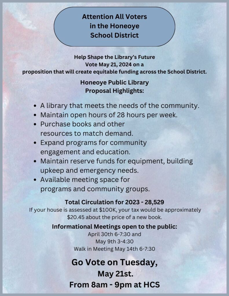 The Honeoye Public Library Board of Trustees is asking the residents of the Honeoye Central School District to consider strengthening the way your Library is funded by making it more equitable and sustainable across the entire school district. This change will make it so that the Library’s budget comes from community-based funding consisting of one library tax approved and paid by all school district residents. This funding proposition will be about $0.2045 per $1,000 of assessed value. This proposition will be voted on by the School District residents May 2024.