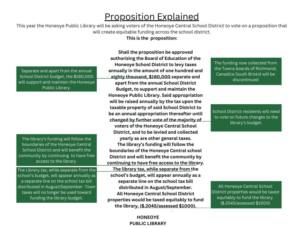This year the Honeoye Public Library will be asking voters of the Honeoye Central School District to vote on a proposition that will create equitable funding across the school district.  This is the proposition: